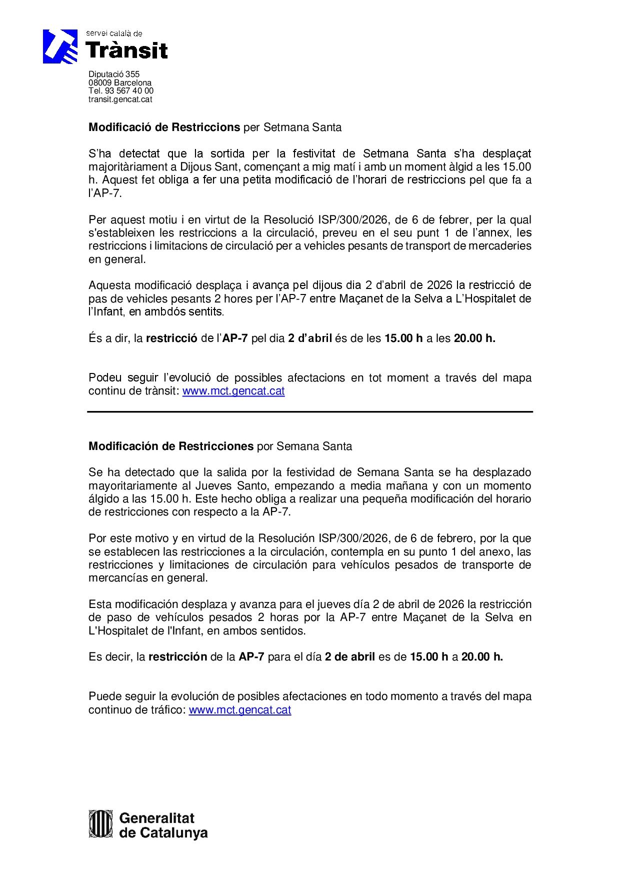 CATALUÑA. MODIFICACIÓN HORARIO RESTRICCIONES AP7